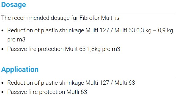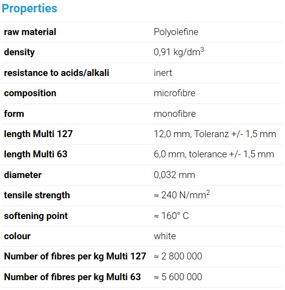 The multifilament fiber Fibrofor Multi improves the properties of concrete, mortar and plaster components. It efficiently reduces shrinkage cracks in the early stages of the setting phase and in most cases replaces reinforcing steel in this area. Fibrofor Multi meets all the criteria and specifications required of pure, multifilament polyolefin fibers for plastic shrinkage reinforcement. Fiber distribution is of crucial importance. It is optimally guaranteed with our 6 or 12 mm long multifilaments. The dosage for underlayments/screeds is at least 600 g/m³ to max. 900 g/m³, for concrete constructions 900 g/m³. For increased fire resistance, a dosage of 2 kg/m³ is generally recommended.